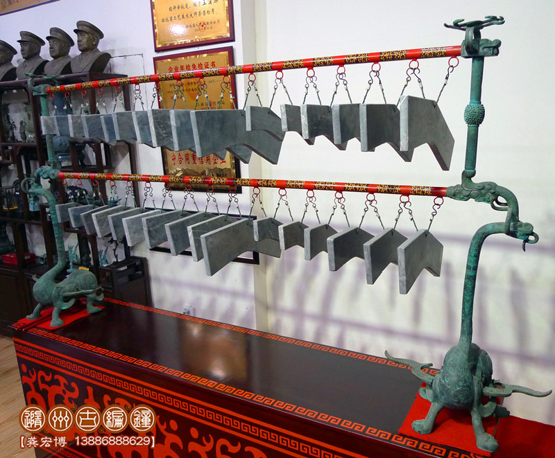 隨州市古編鐘文化發(fā)展有限公司通過考證歷史資料進行研究分析,并八方尋找石源,終于將這套2400多年前的戰(zhàn)國初期大型編磬復(fù)制出來,其發(fā)音與原編磬的標音銘文相符,低音渾厚洪高,高音明澈,音色優(yōu)美而動聽,音域達三個八度,可以旋宮轉(zhuǎn)調(diào),演奏多種樂曲。