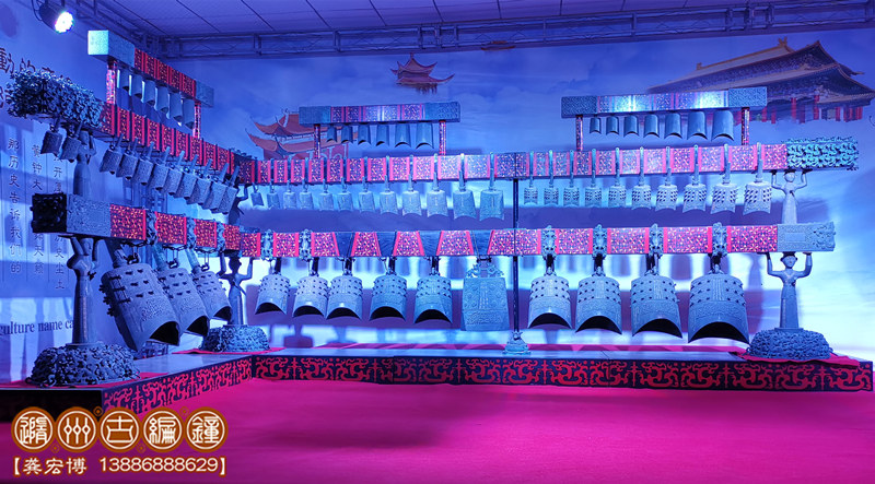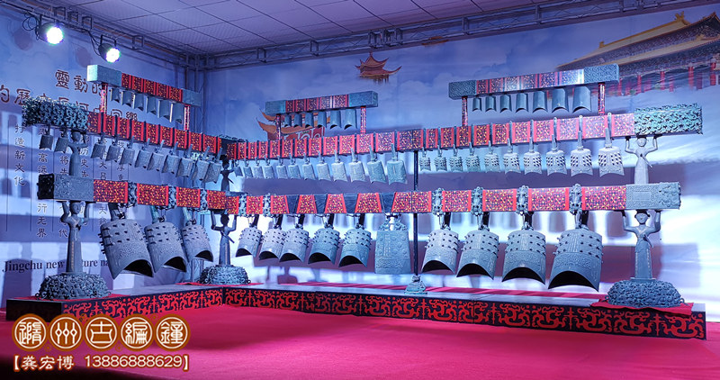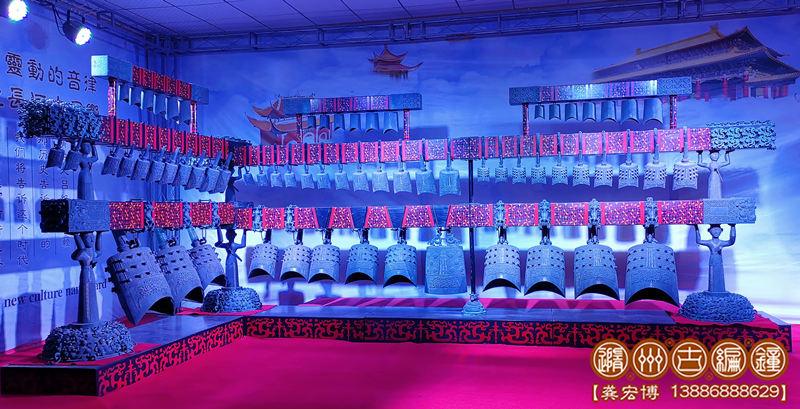 技術(shù)標(biāo)準(zhǔn):鑄件要求紋飾清晰,表面光潔,無裂、刺、孔、糙等鑄造缺陷;整套編鐘音域5個八度,一鐘雙音,按國際標(biāo)準(zhǔn)A=440Hz調(diào)音,音準(zhǔn)控制在±5Hz內(nèi),音色統(tǒng)一協(xié)調(diào),無雜、啞音響。其中下層13件為倍低音甬鐘,在演奏中起到烘托氣氛的作用,中層33件為中音域甬鐘,十二半音齊備,主要用于演奏主旋律,上層19件為被高音鐘和補音鐘,也是重要的半音和補充被高音音域,3組設(shè)計可以用于演奏復(fù)試旋律。其結(jié)構(gòu)、配件、銘文等全部按照曾侯乙編鐘樣式仿制。