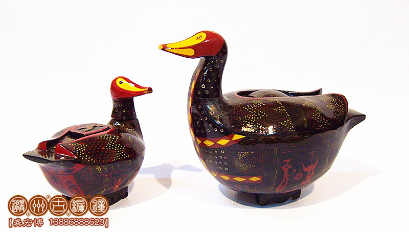 簡(jiǎn)介:鴛鴦盒為木胎其身,體分兩半,制作再粘合成,頭頸與身體則榫卯相連,故頭能自由轉(zhuǎn)動(dòng)。背上有一長(zhǎng)方形口與蓋相扣合,蓋上浮雕龍紋。整器外髹黑漆,其上用紅色和金色描繪眼、嘴、羽毛以及菱形紋等。在它的腹部還描繪了建鼓舞和撞鐘擊磬的情節(jié)畫。