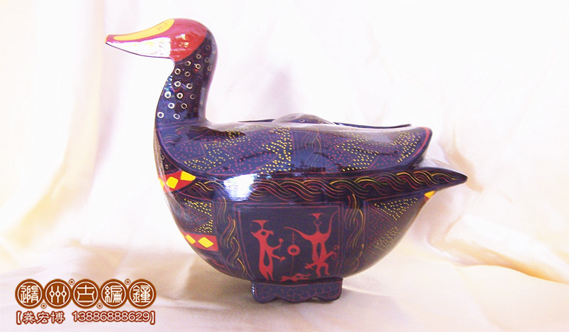 鴛鴦盒為木胎其身,體分兩半,制作再粘合成,頭頸與身體則榫卯相連,故頭能自由轉(zhuǎn)動(dòng)。背上有一長(zhǎng)方形口與蓋相扣合,蓋上浮雕龍紋。整器外髹黑漆,其上用紅色和金色描繪眼、嘴、羽毛以及菱形紋等。在它的腹部還描繪了建鼓舞和撞鐘擊磬的情節(jié)畫??脊棚@示為古代宮女漆盒、木豆或胭脂盒。